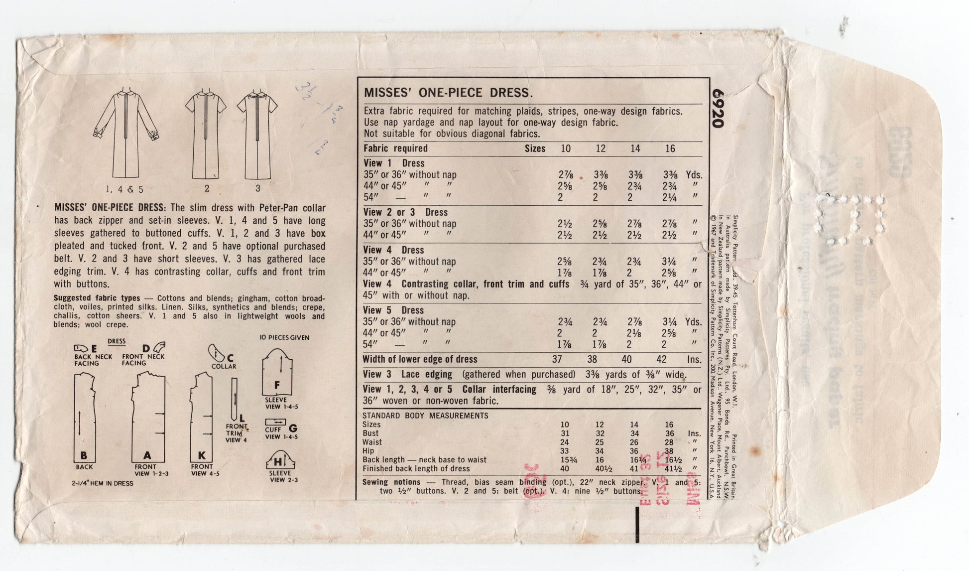 Simplicity 6920 vintage sewing pattern, dated 1966.