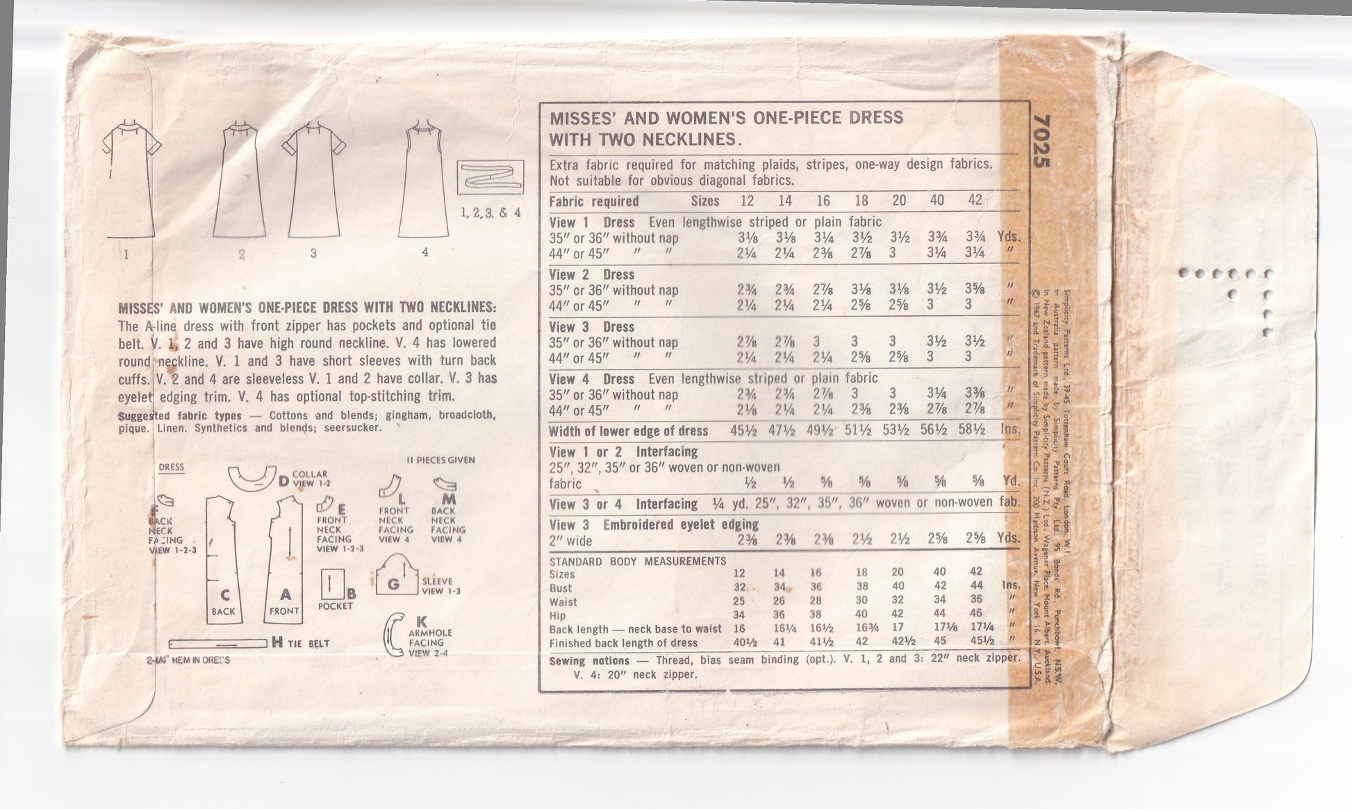 Simplicity 7025 vintage paper sewing pattern, dated circa 1967.
