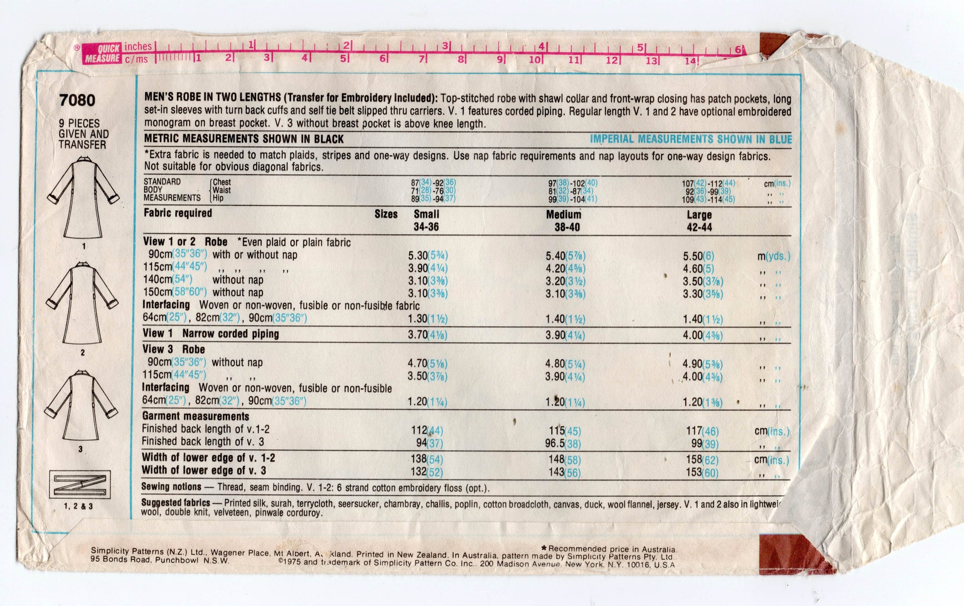 Simplicity 7080 Mens Shawl Collar Robe 1970s Vintage Sewing Pattern Size Large Chest 42 - 44 inches