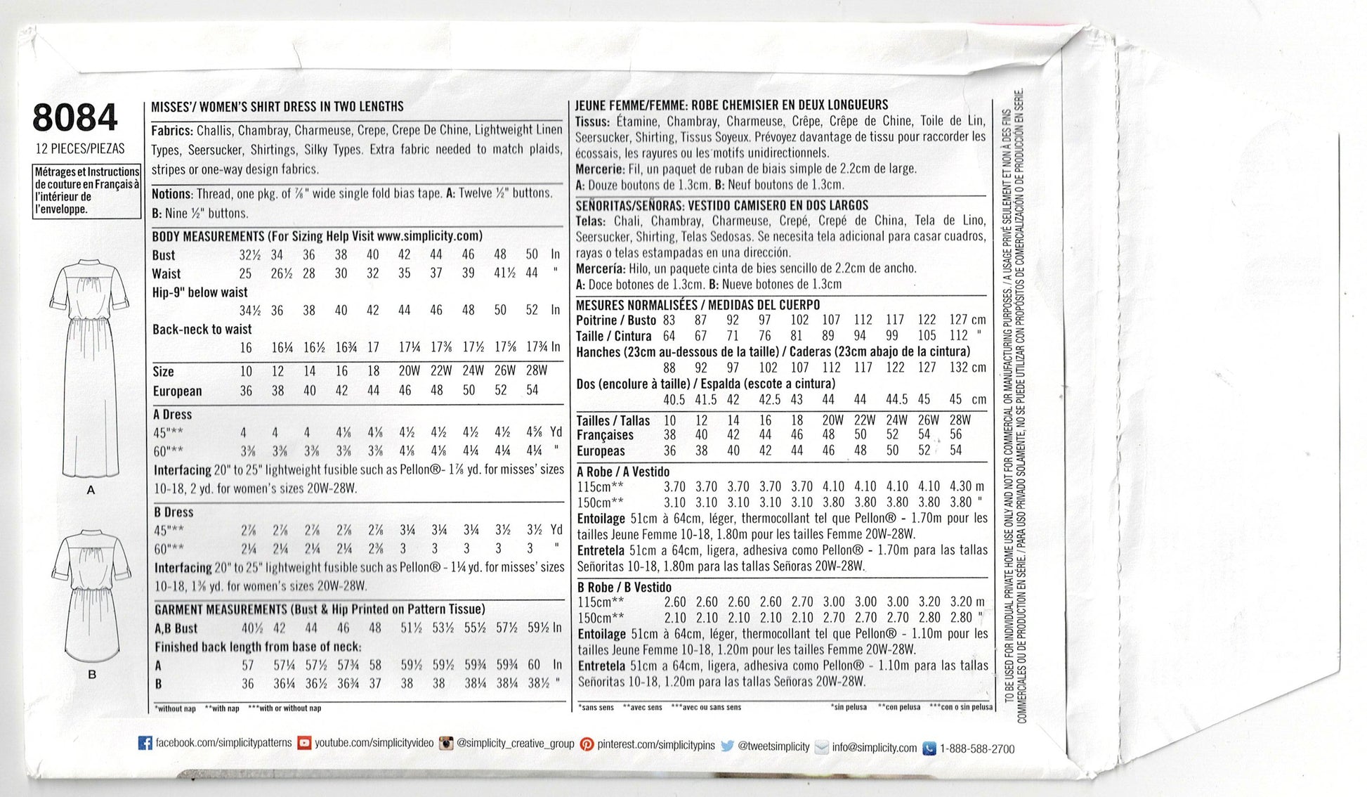 Simplicity 8084 sewing pattern, dated 2015, now out of print.