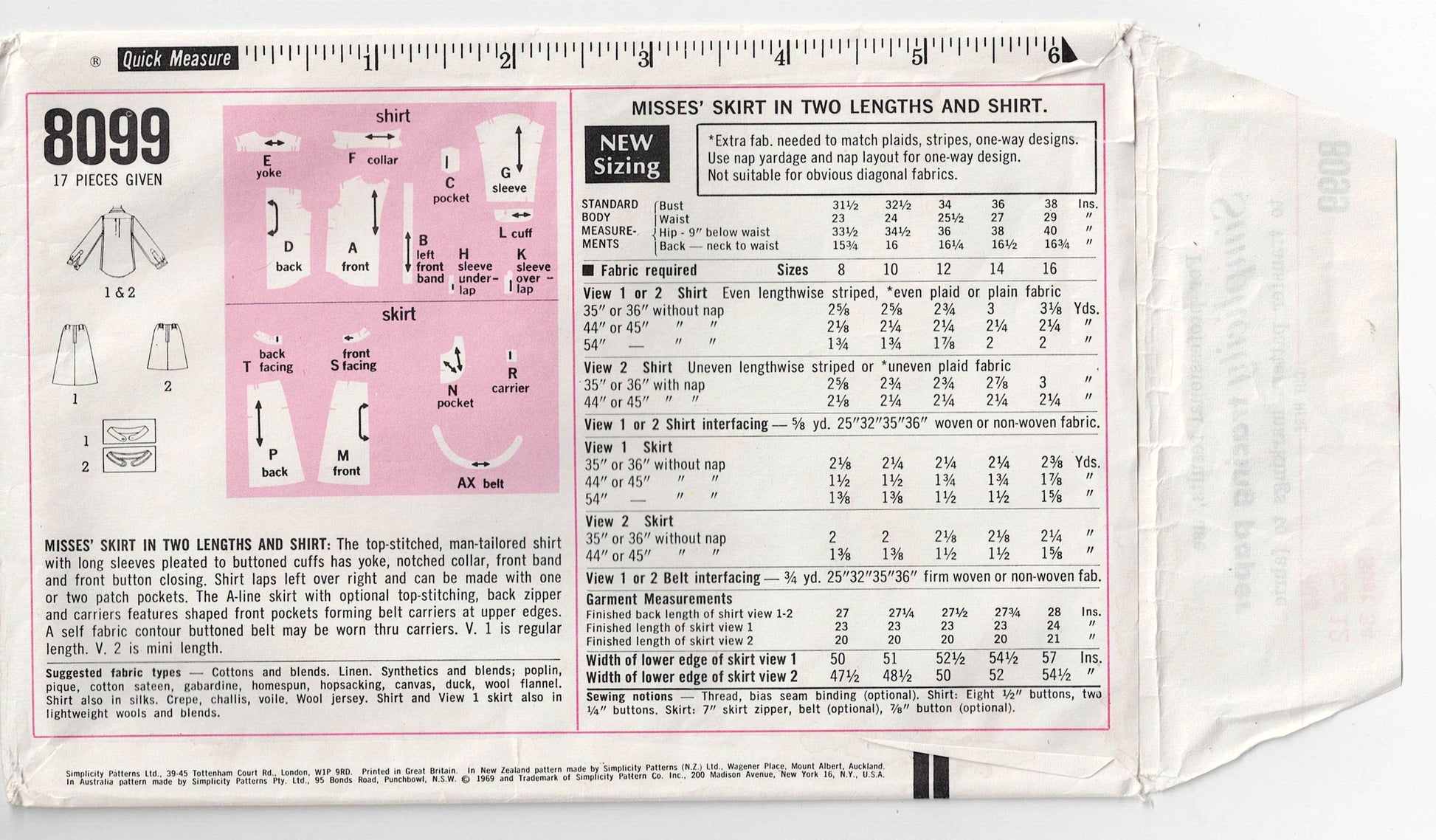 Simplicity 8099 Womens A Line Skirt & Classic Shirt 1960s Vintage Sewing Pattern Size 12 Bust 34 inches