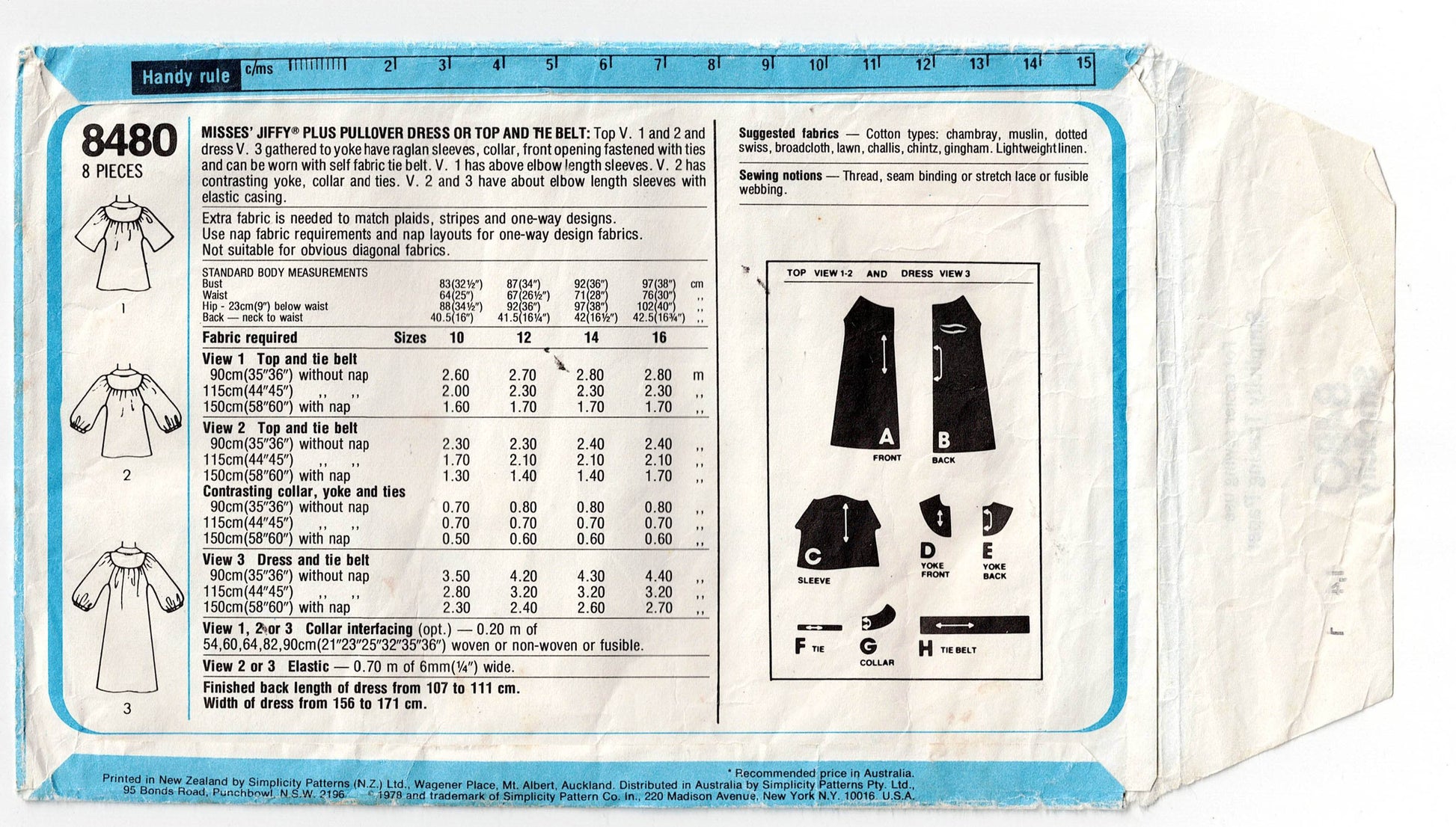 Top V.1 and 2 and dress V. 3 gathered to yoke have raglan sleeves, collar, front opening fastened with ties and can be worn with self tie belt. V. 1 has above elbow length sleeves. V. 2 has contrasting yoke, collar and ties. V. 2 and 3 have about elbow length sleeves with elastic casings.