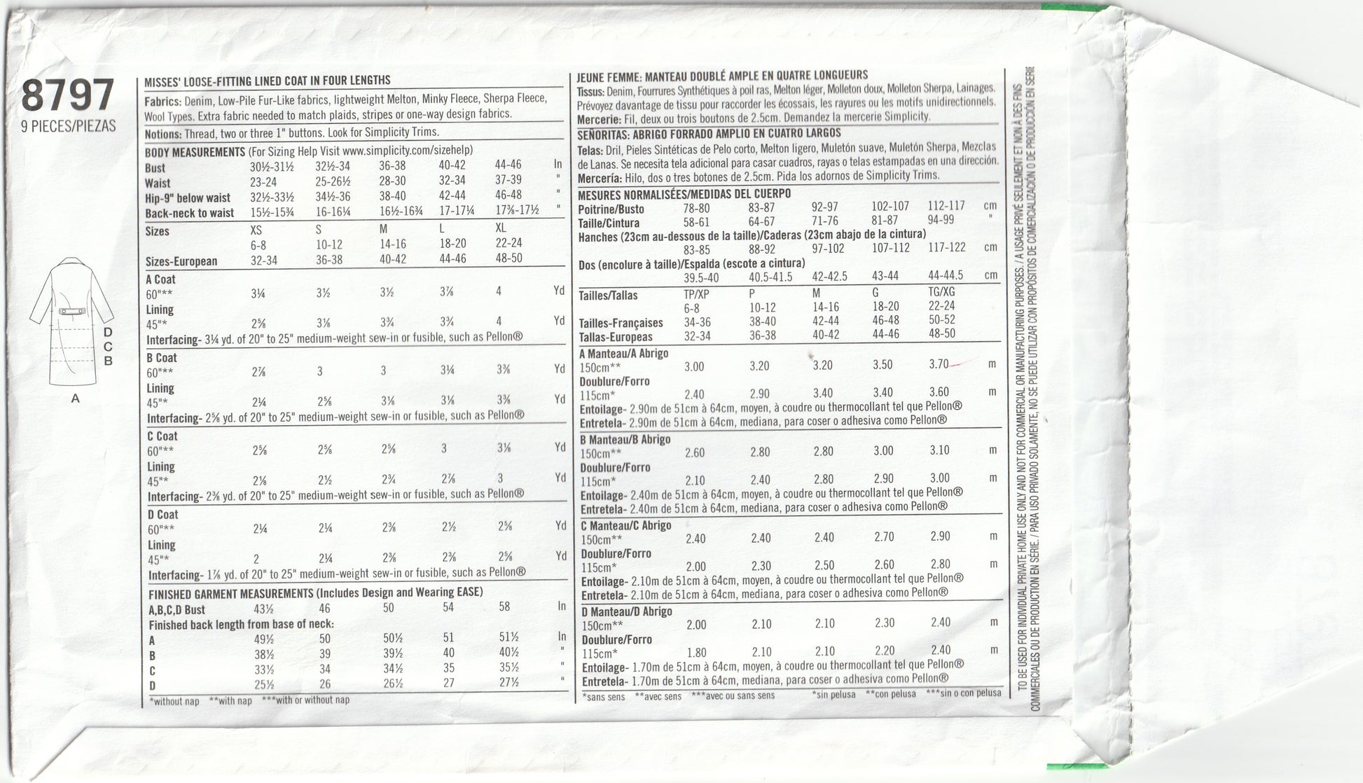 Simplicity 8797 Womens Wide Lapel Coat & Jacket Out Of Print Paper Sewing Pattern Sizes XS - XL UNCUT Factory Folded