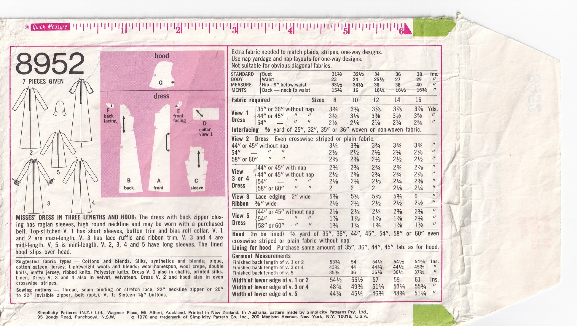 Simplicity 8952 Womens EASY Raglan Sleeved Dress in 3 Lengths & Hood 1970s Vintage Sewing Pattern Size 12 Bust 34 Inches