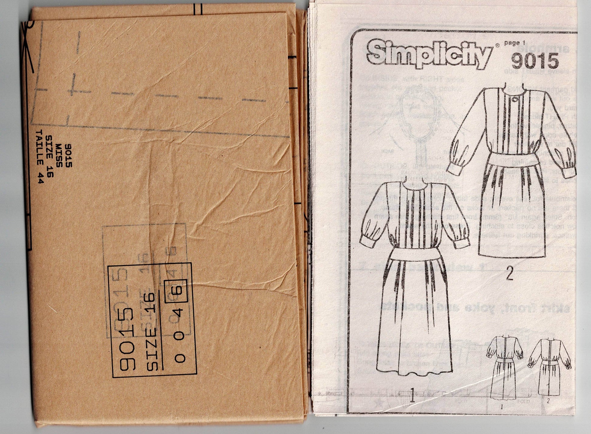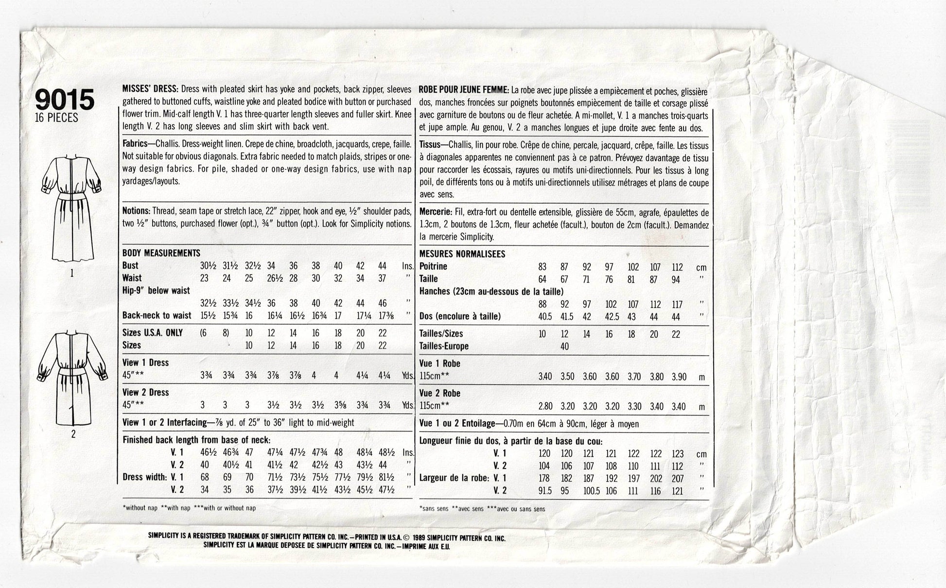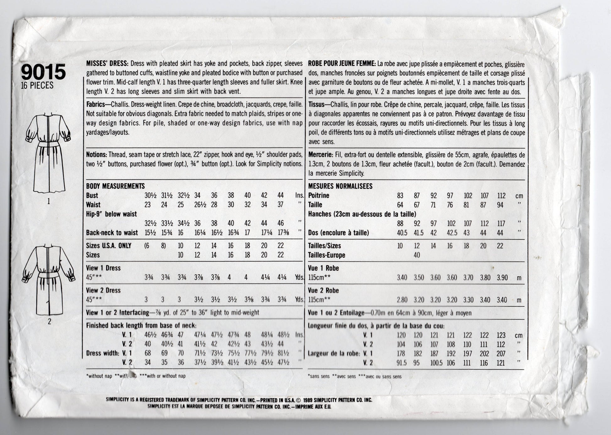 Simplicity 9015 vintage sewing pattern, dated 1989.
