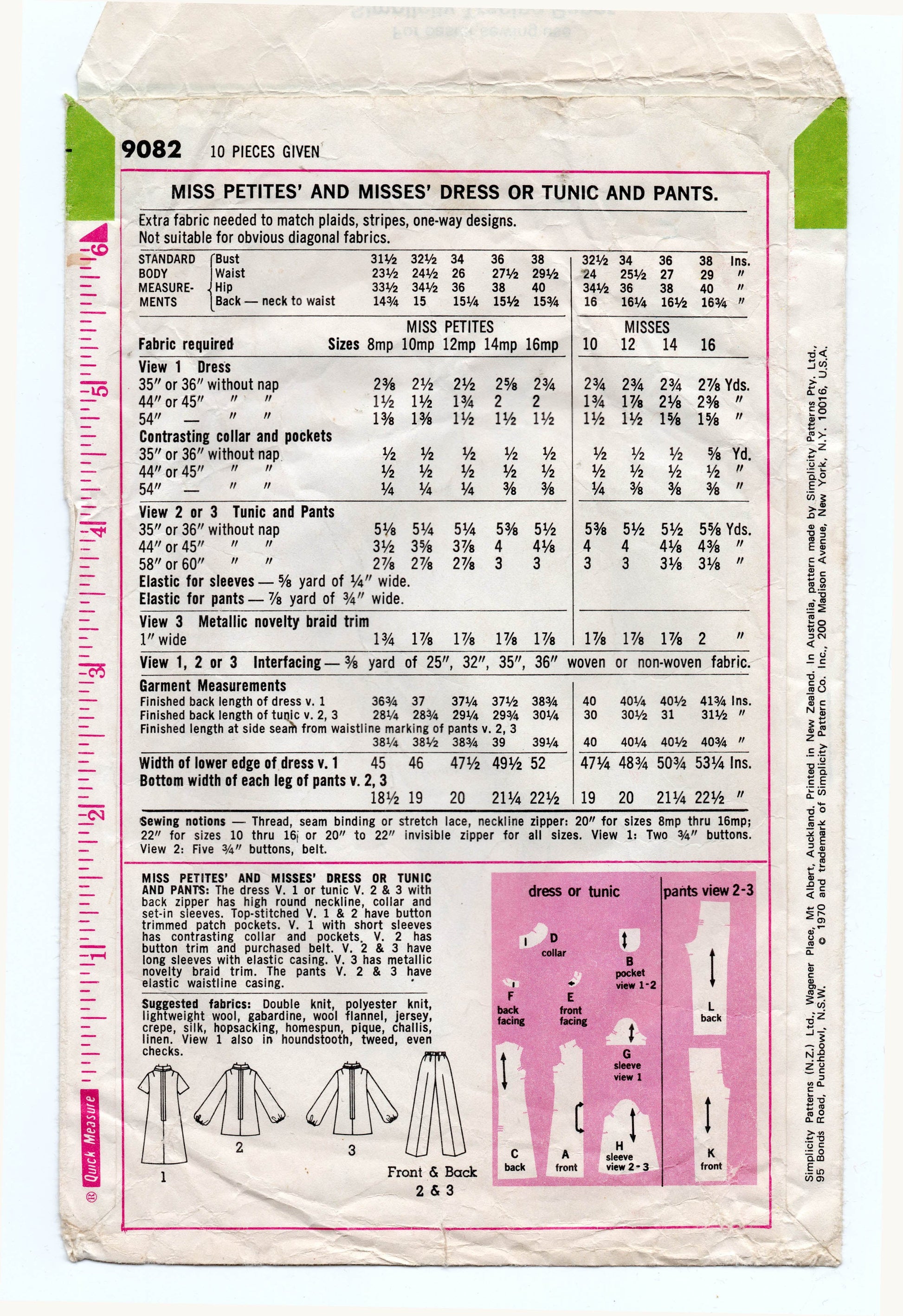 Simplicity 9082 Womens Dress Tunic & Pants 1970s Vintage Sewing Pattern Size 14 Bust 36 inches