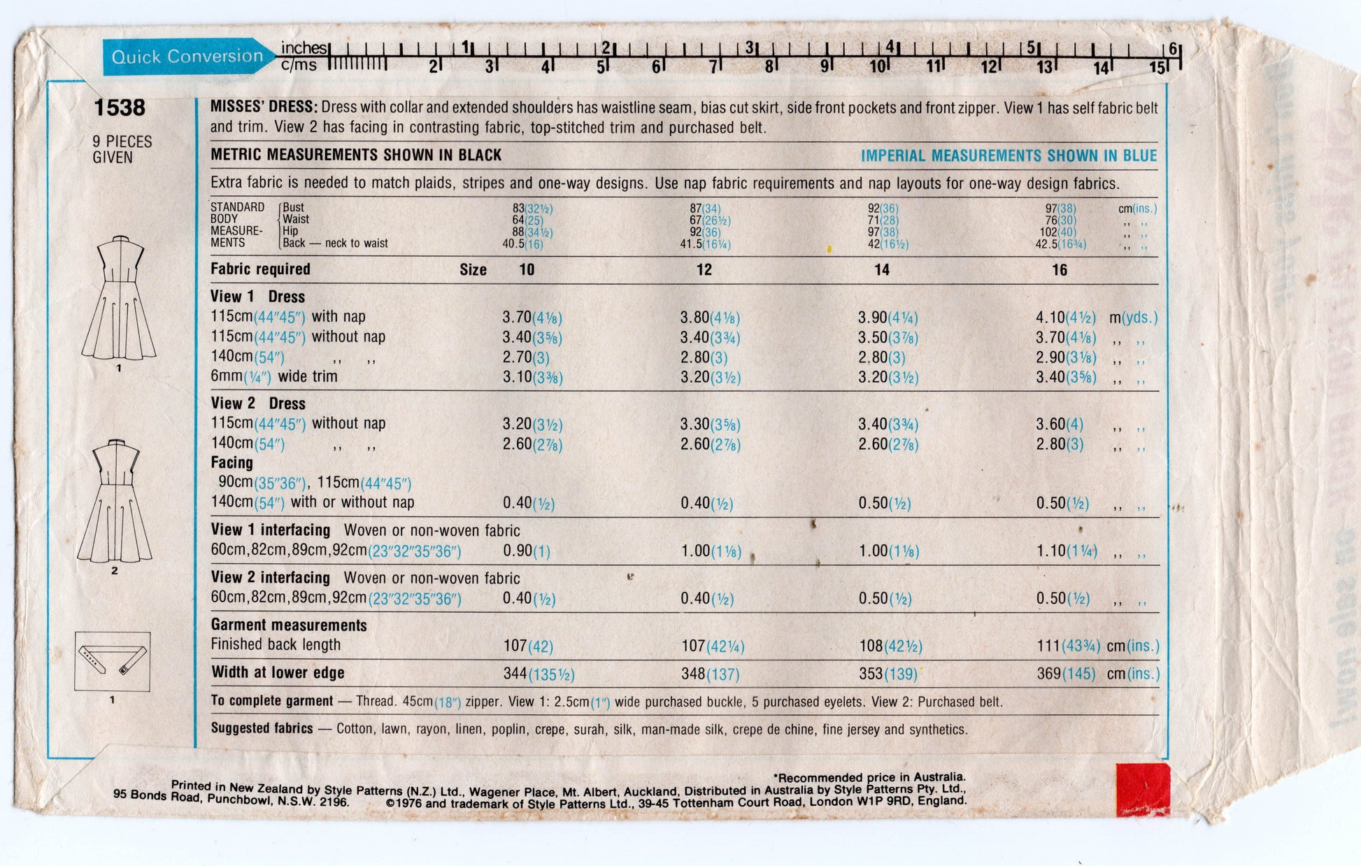 Style 1538 Womens Zip Front Dress with Pockets 1970s Vintage Sewing Pattern Size 12 Bust 34 inches