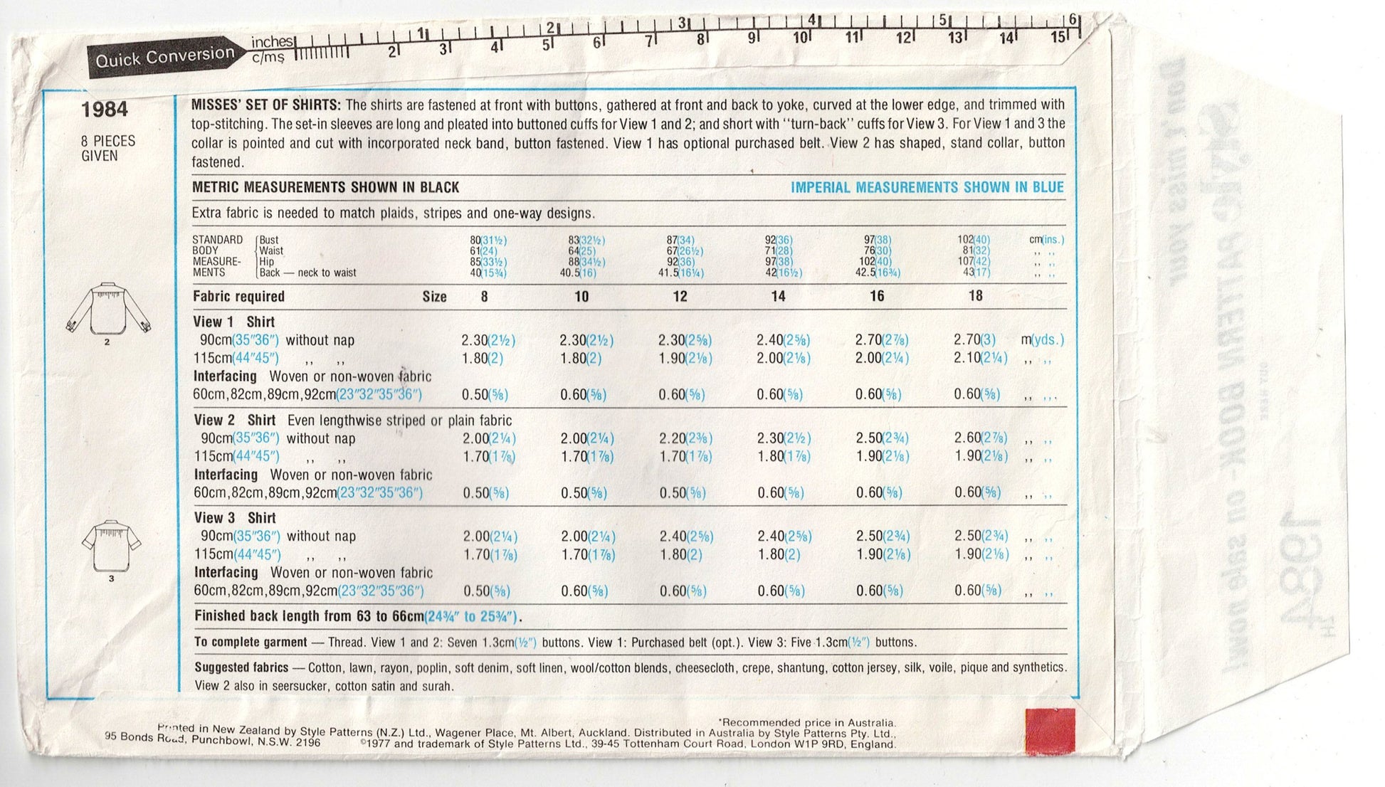 Style 1984 Womens Classic Shirts 1970s Vintage Sewing Pattern Size 16 or 18 Bust 38 or 40 Inches