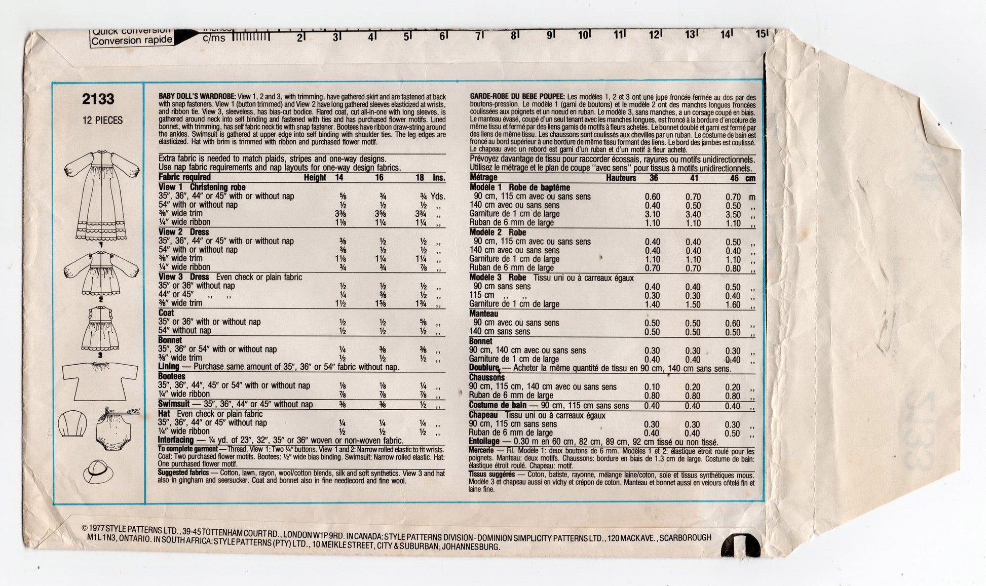 Style 2133 Retro Baby Doll's Wardrobe for 16 or 18 Inch Dolls 1970s Vintage Sewing Pattern