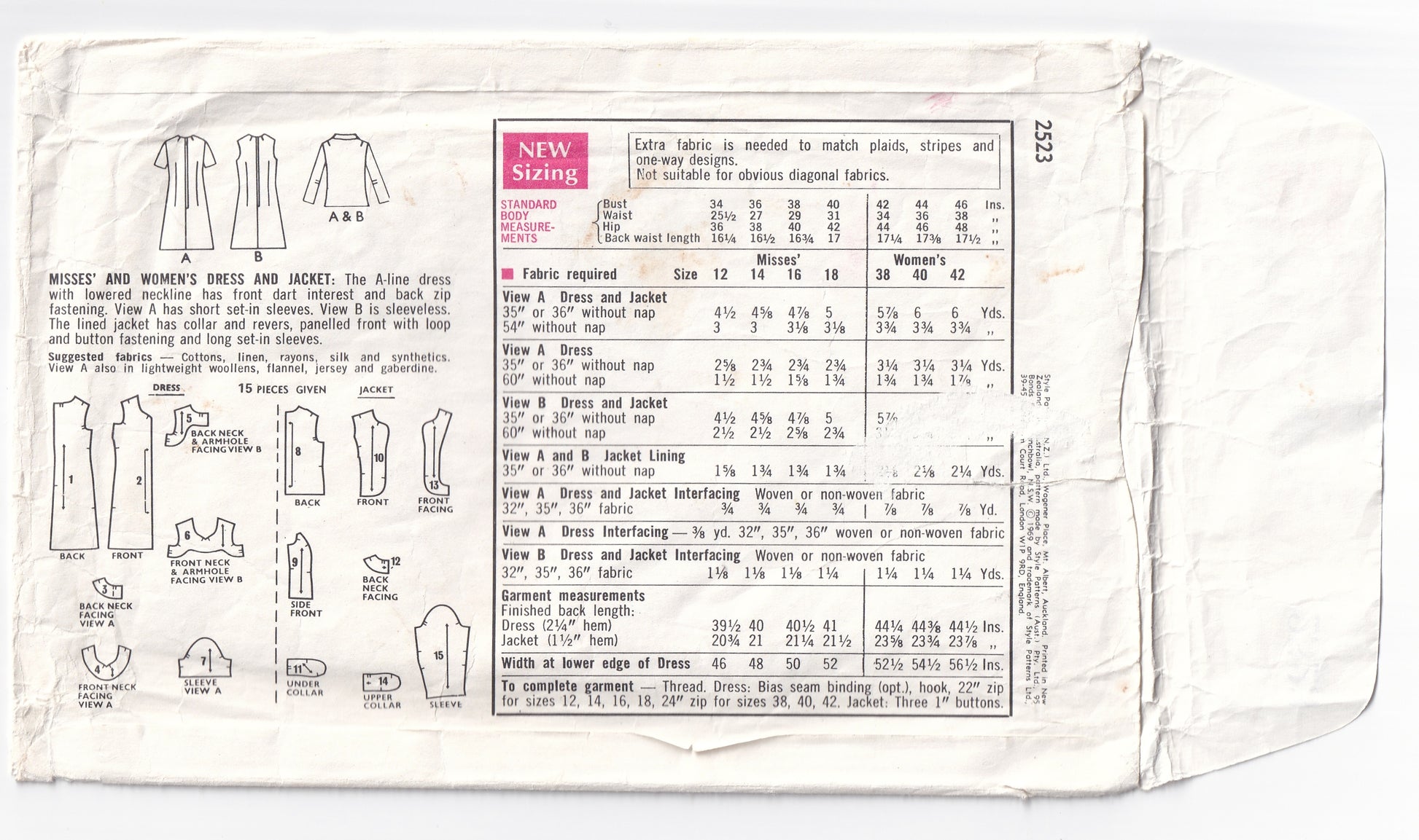Style 2523 vintage sewing pattern, dated 1969.