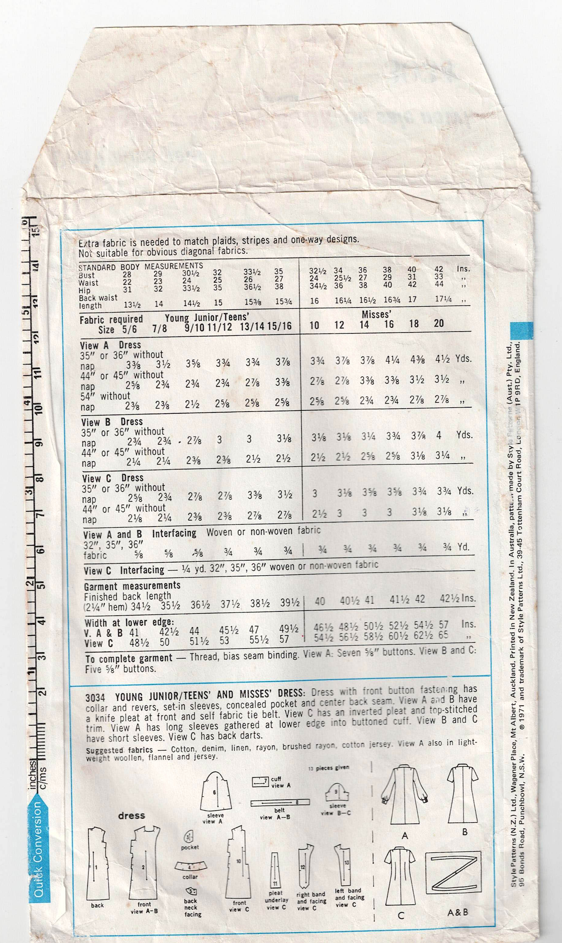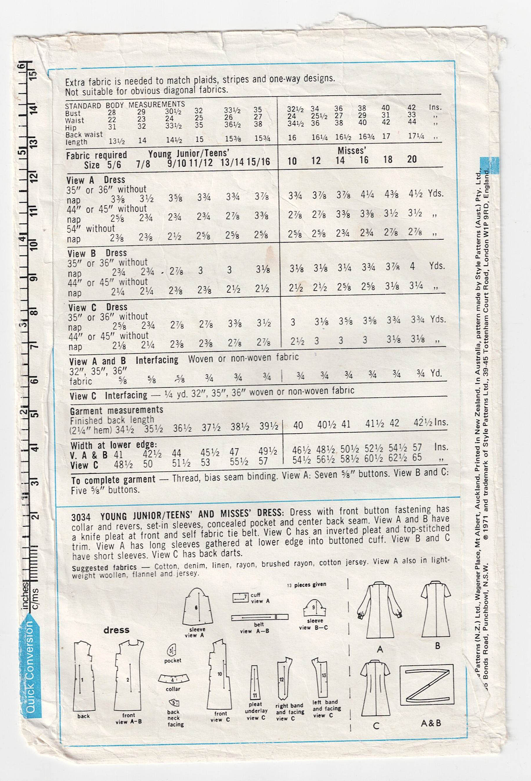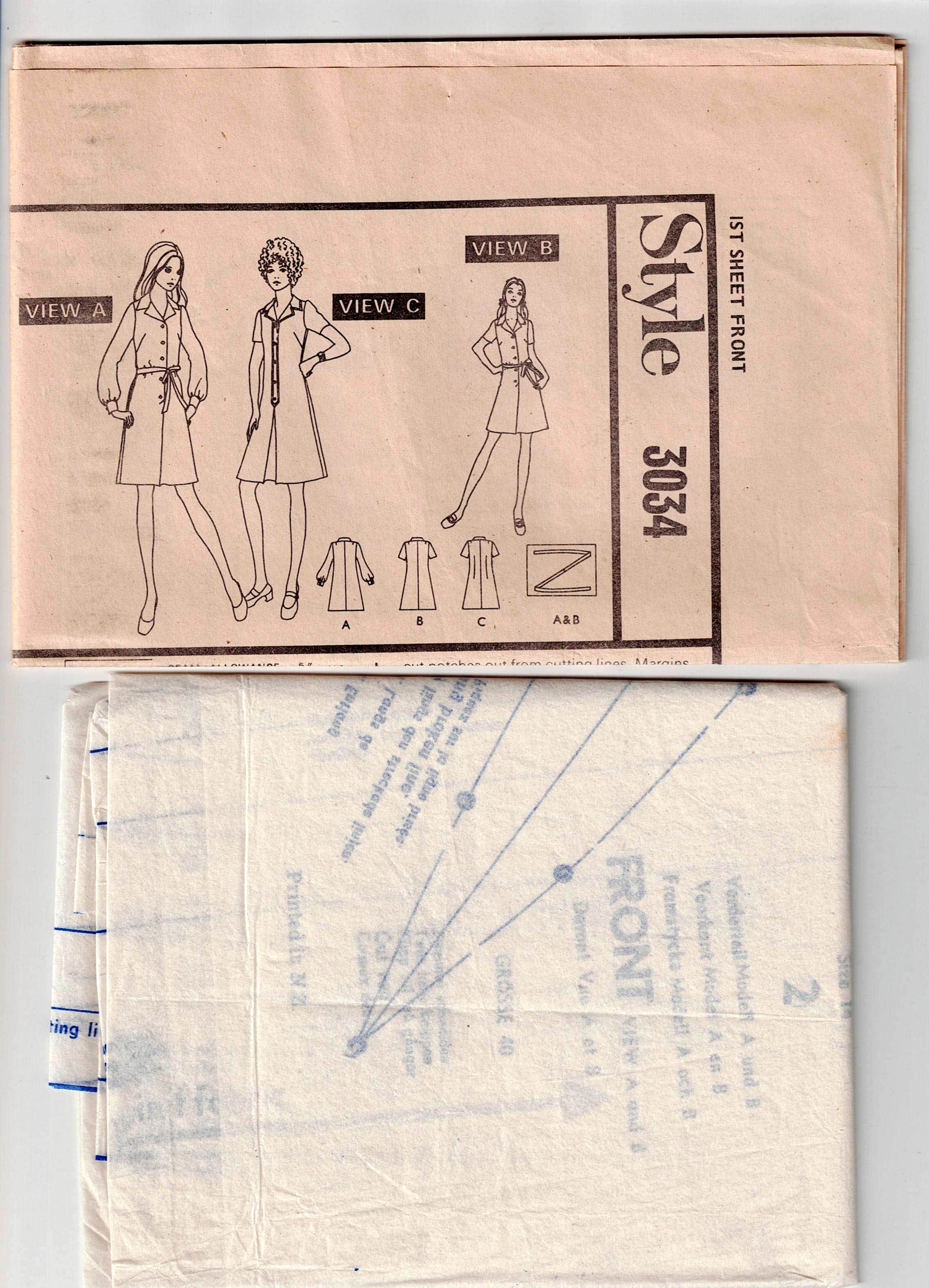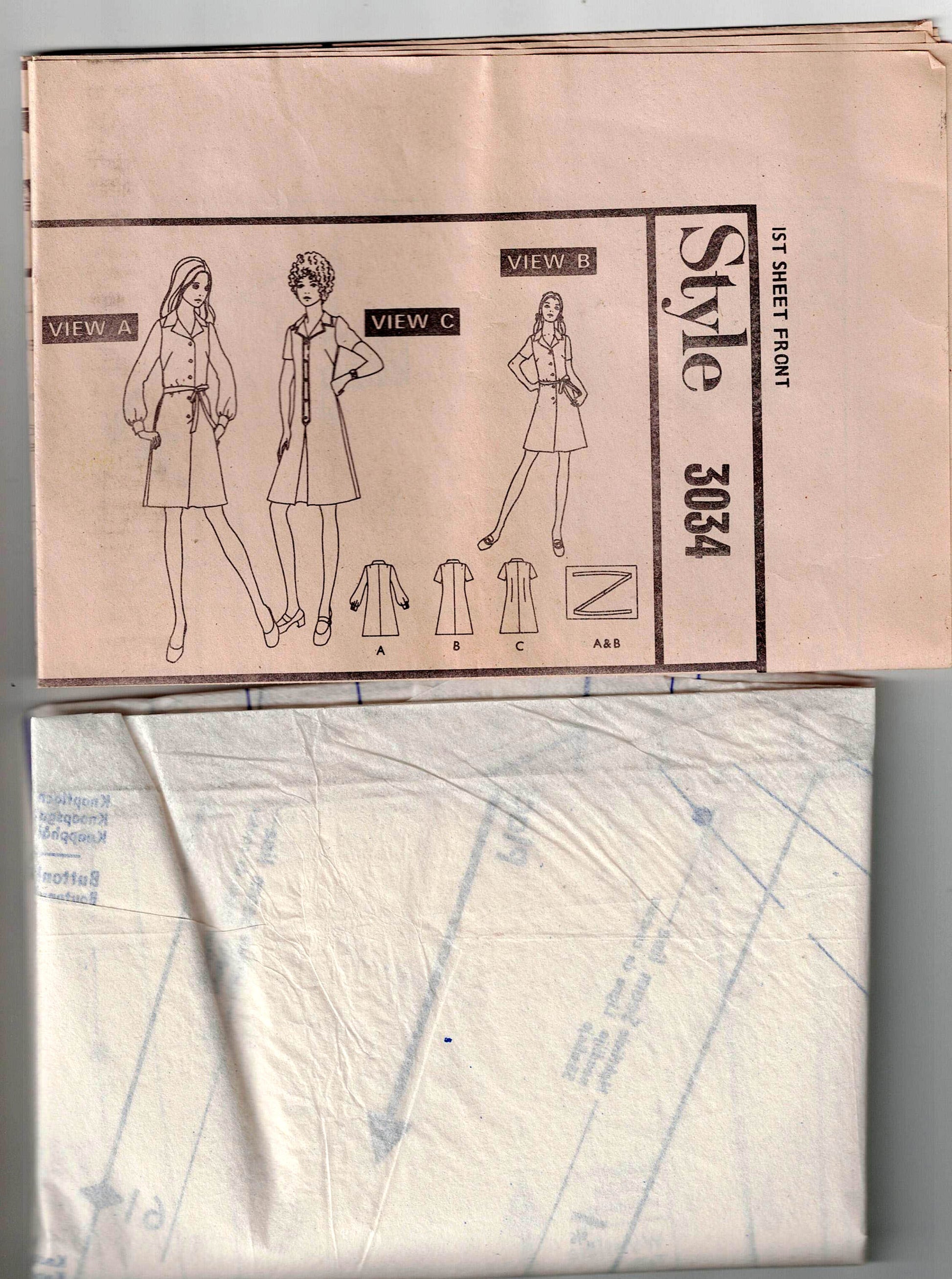 Style 3034 Womens Classic Fit & Flared Shirtdress 1970s Vintage Sewing Pattern Size 12 or 14