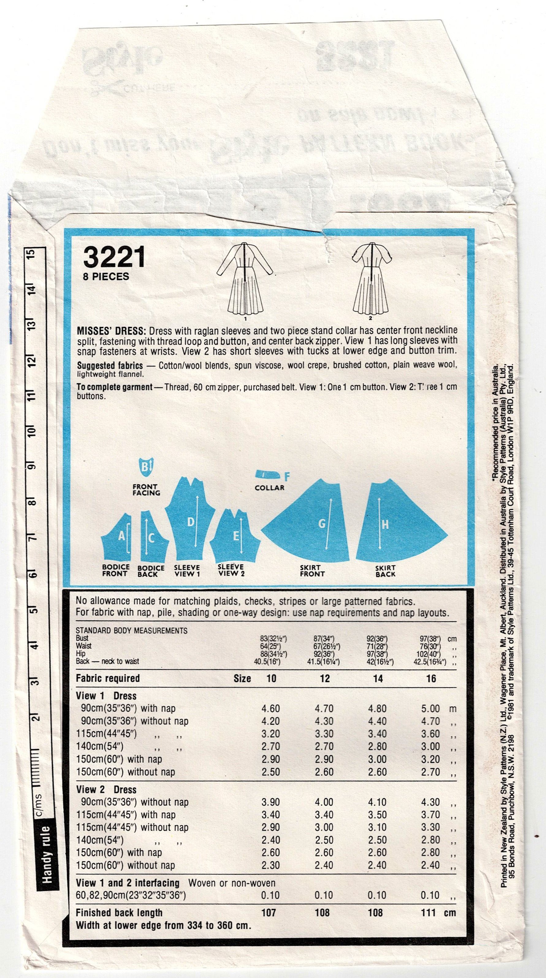 Style 3221 Womens Raglan Sleeved Dress with Mandarin Collar 1980s Vintage Sewing Pattern Size 12 Bust 34 inches