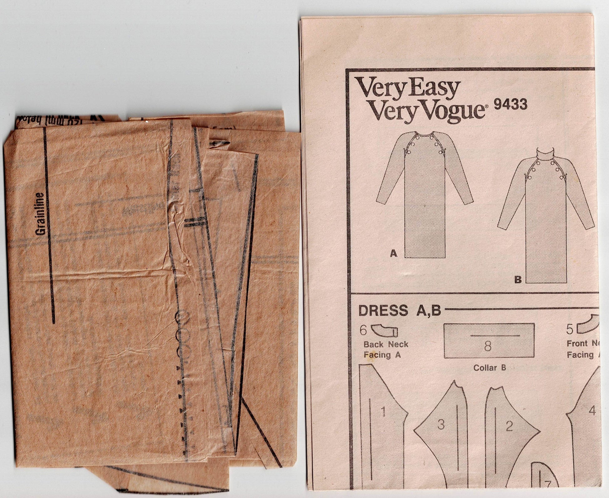 Very Easy Vogue 9433 Womens Raglan Sleeved Dress with Stand Up Collar & Pockets 1980s Vintage Sewing Pattern Size 8 & 10