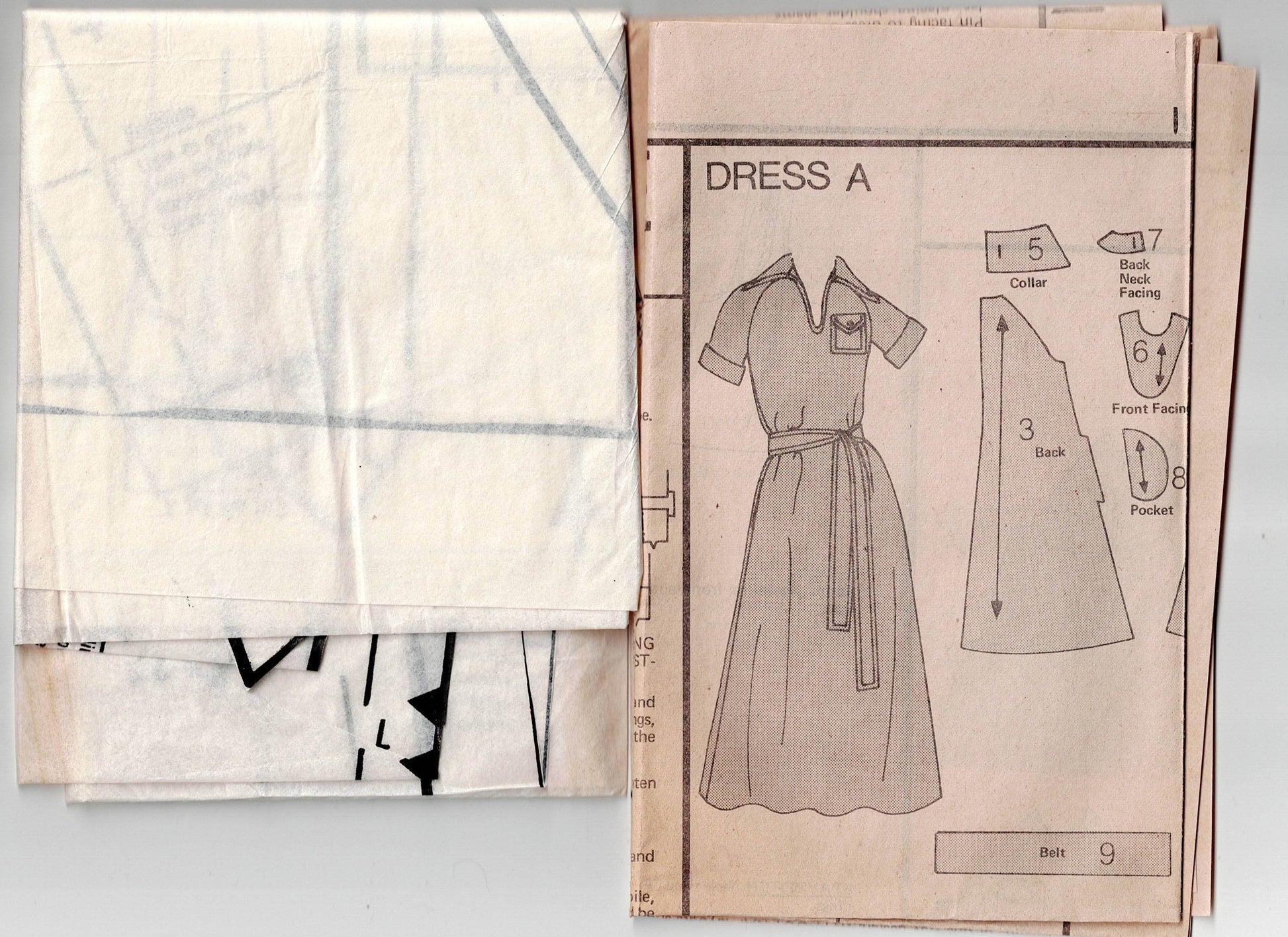 Loose-fitting dress, three inches below mid-knee, has pointed collar, rounded front neckline slit, pockets in side seams and back zipper closing. Raglan sleeves are above-elbow length with turn-back cuffs or full-length gathered into buttoned cuffs. With or without patch pockets with fold-back flap and button trim. Self tie belt holds in fullness at waistline. Topstitching.
