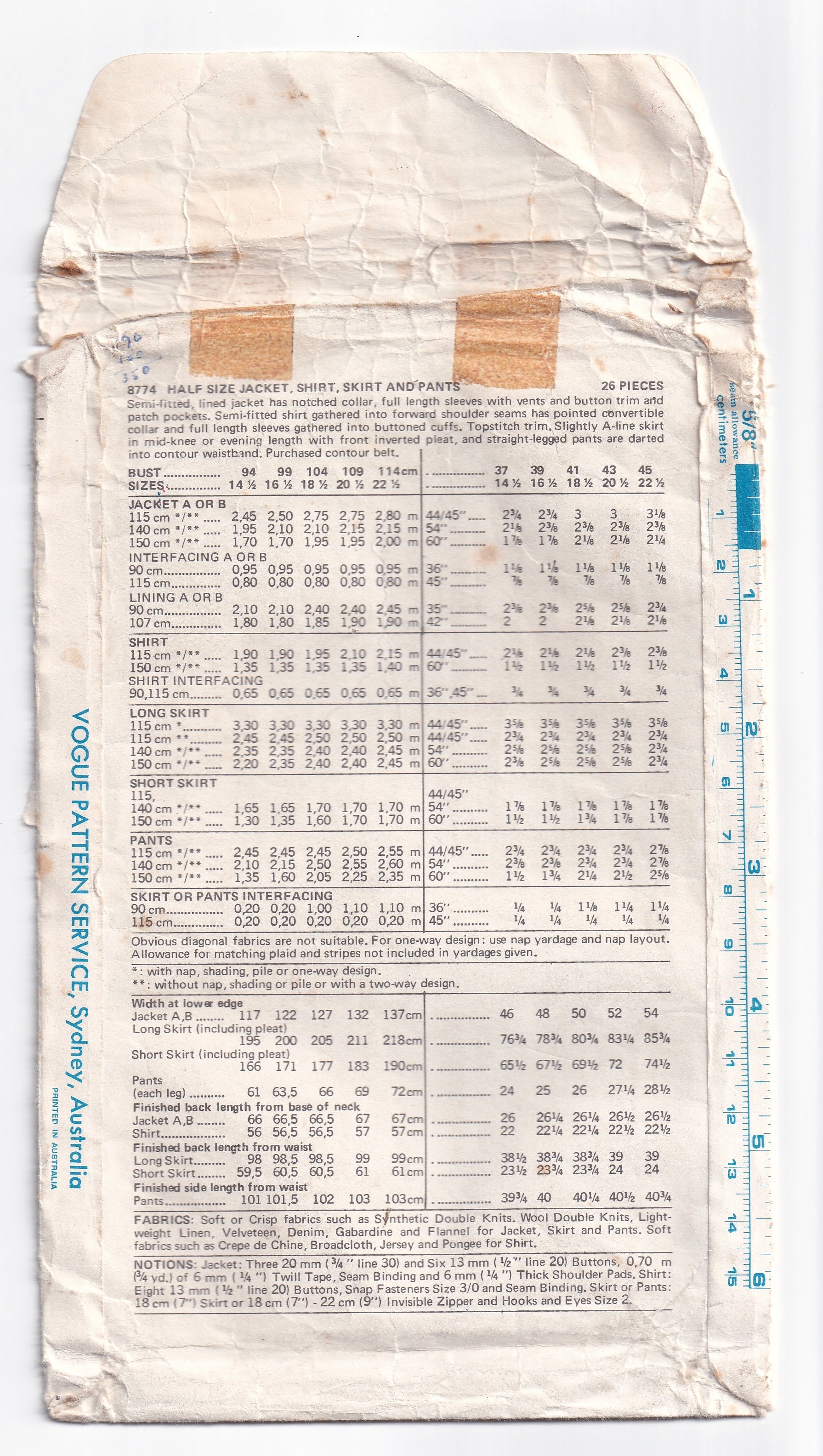 Vogue 8774 Womens Half Size Wide Collar Jacket Shirt Flared Pants & Skirt 1970s Vintage Paper Sewing Pattern Bust 43 inches