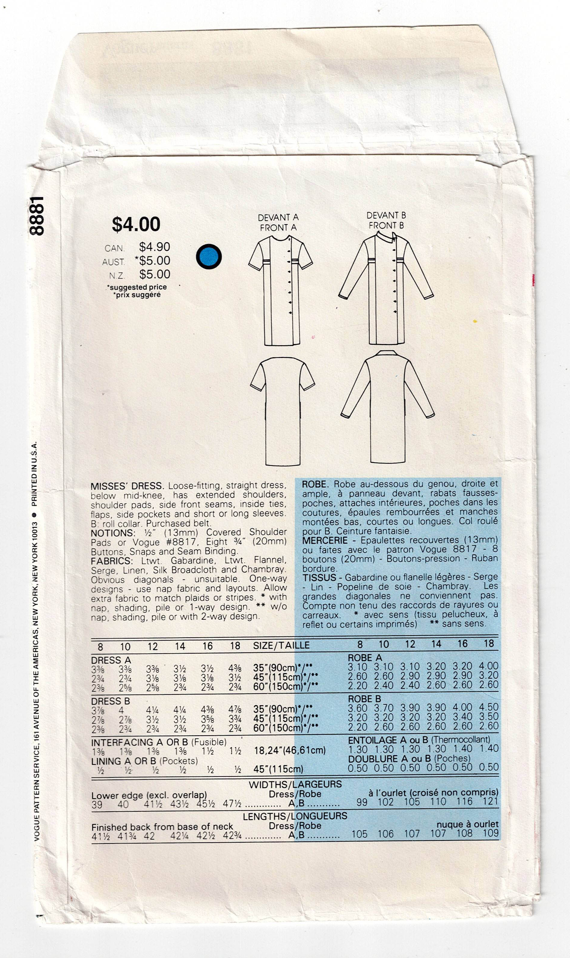 Vogue 8881 vintage sewing pattern; dated 1984.