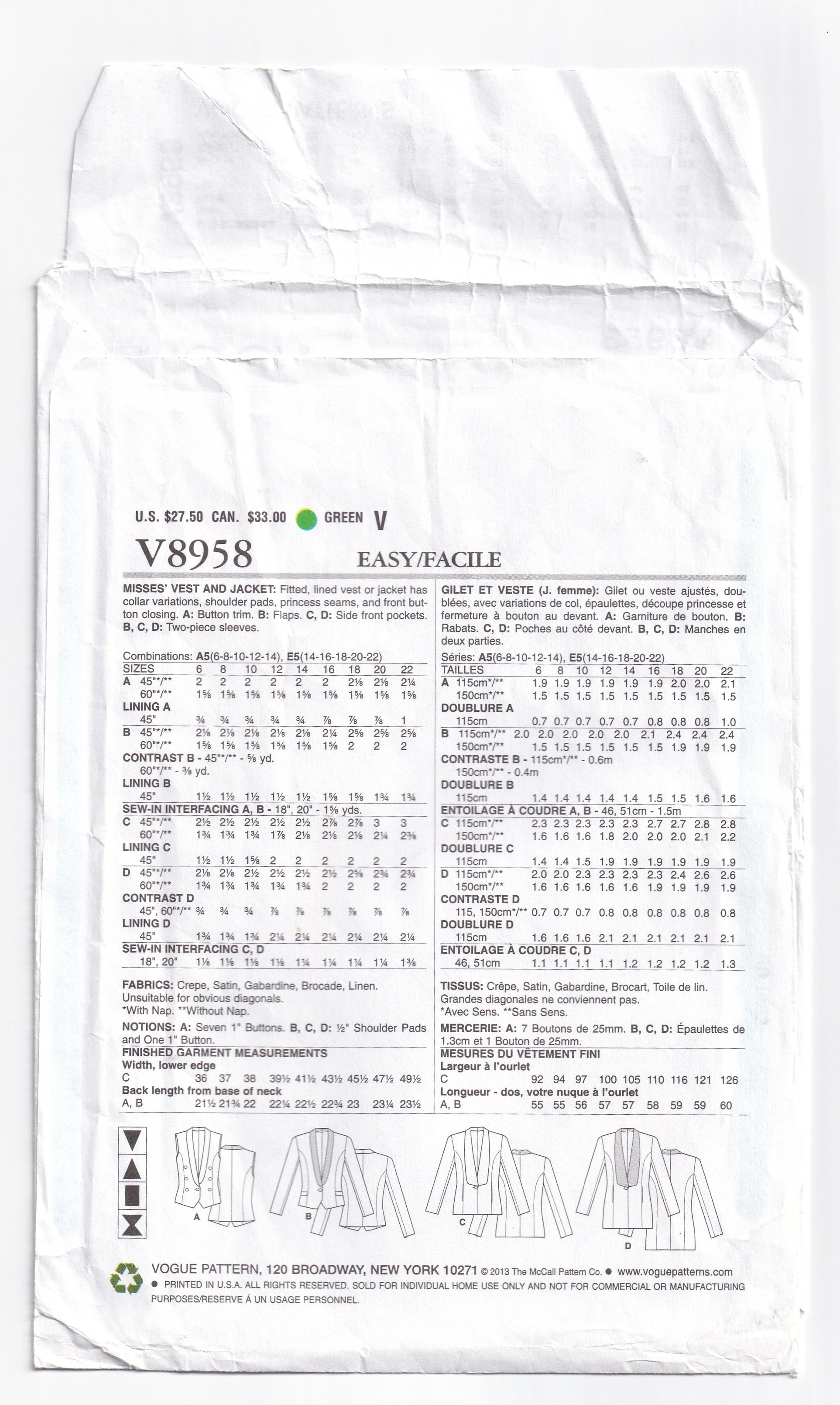 Vogue 8958 sewing pattern, dated 2012, now out of print.