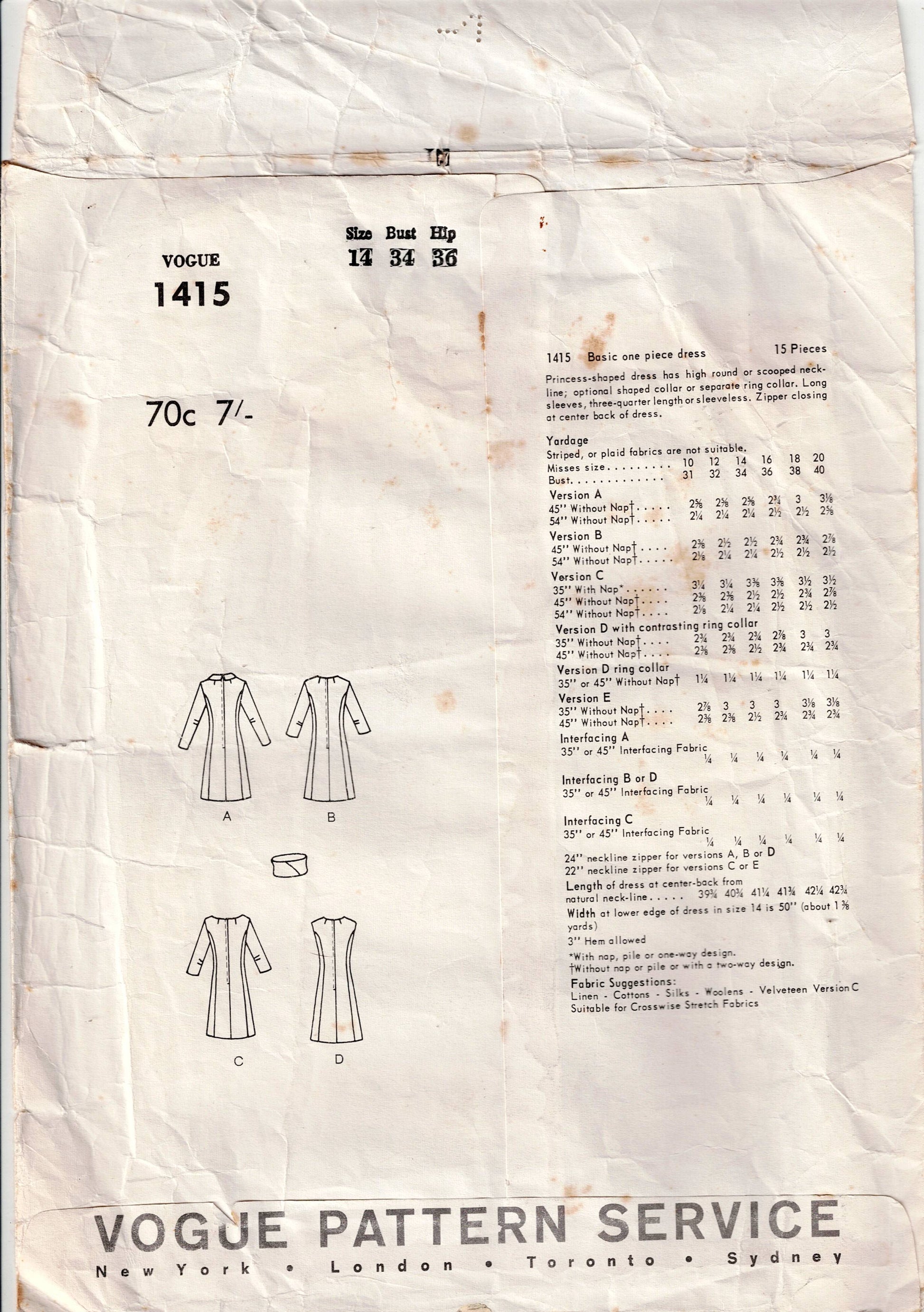 Vogue Basic Design 1415 Vintage sewing pattern; ©1964.