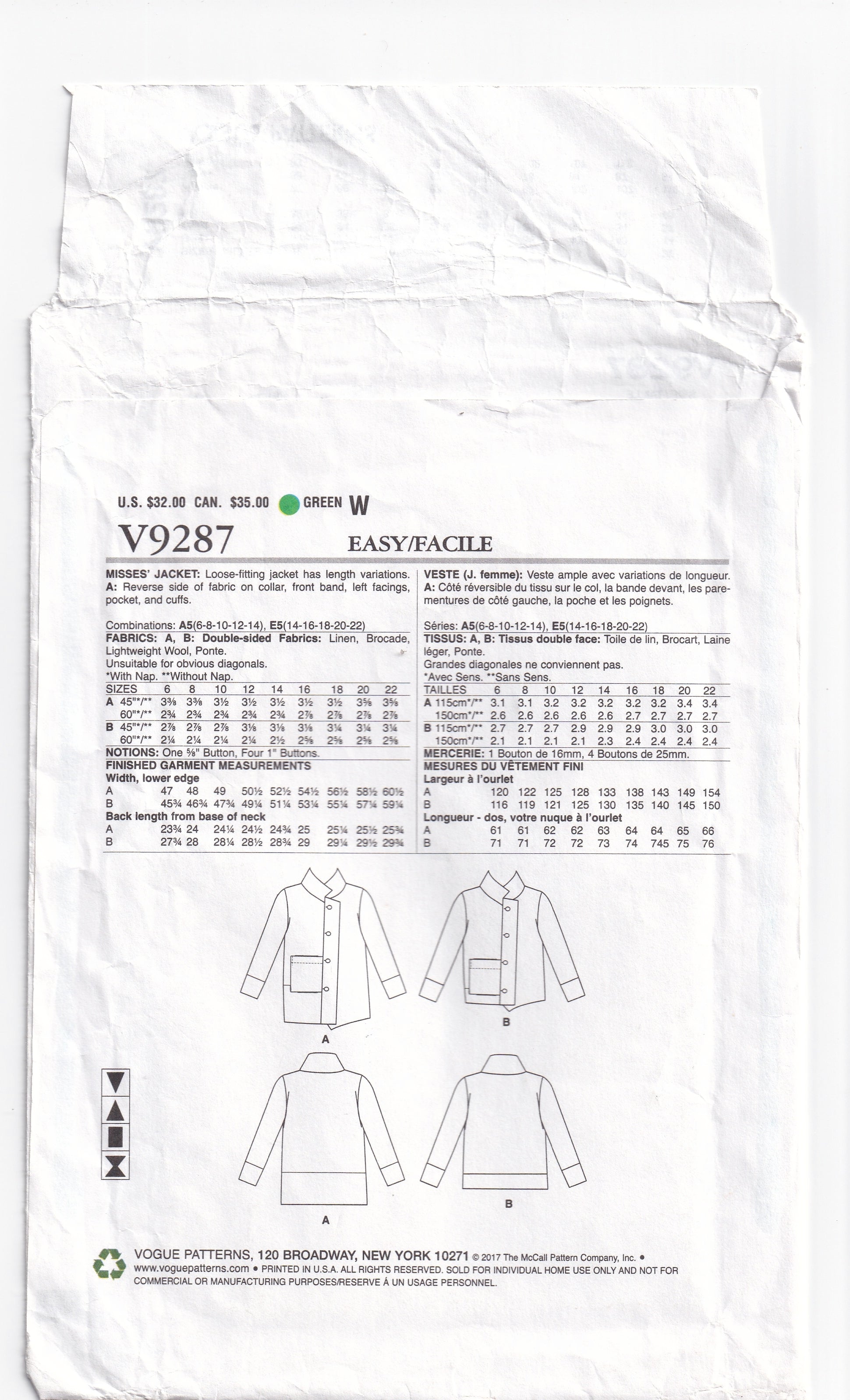 Vogue V9287 out of print paper sewing pattern, dated 2013.