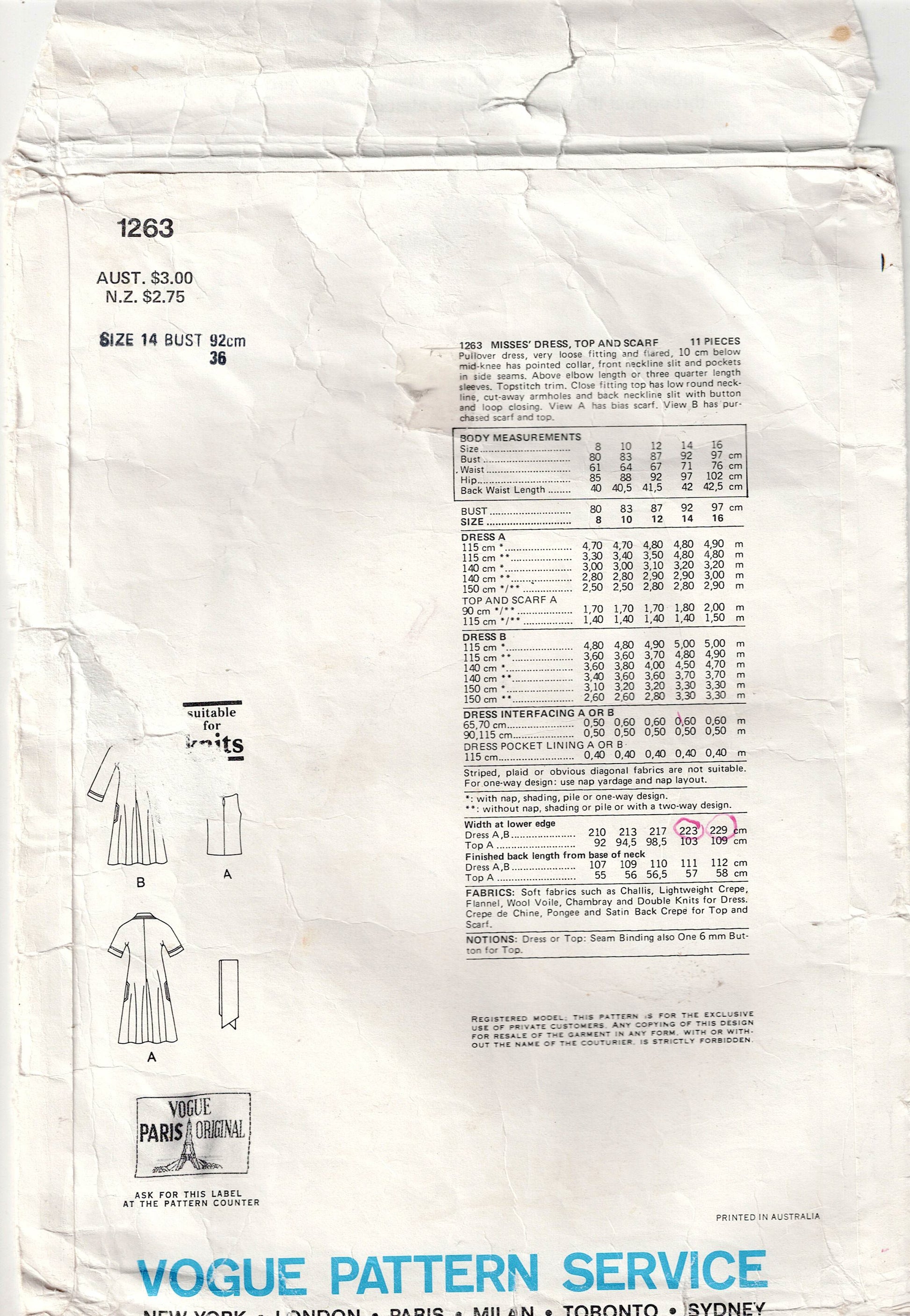 Vogue Paris Original 1263 CHLOE Womens Wide Collar Tent Dress Top & Scarf 1970s Vintage Sewing Pattern Size 14 Bust 36 inches