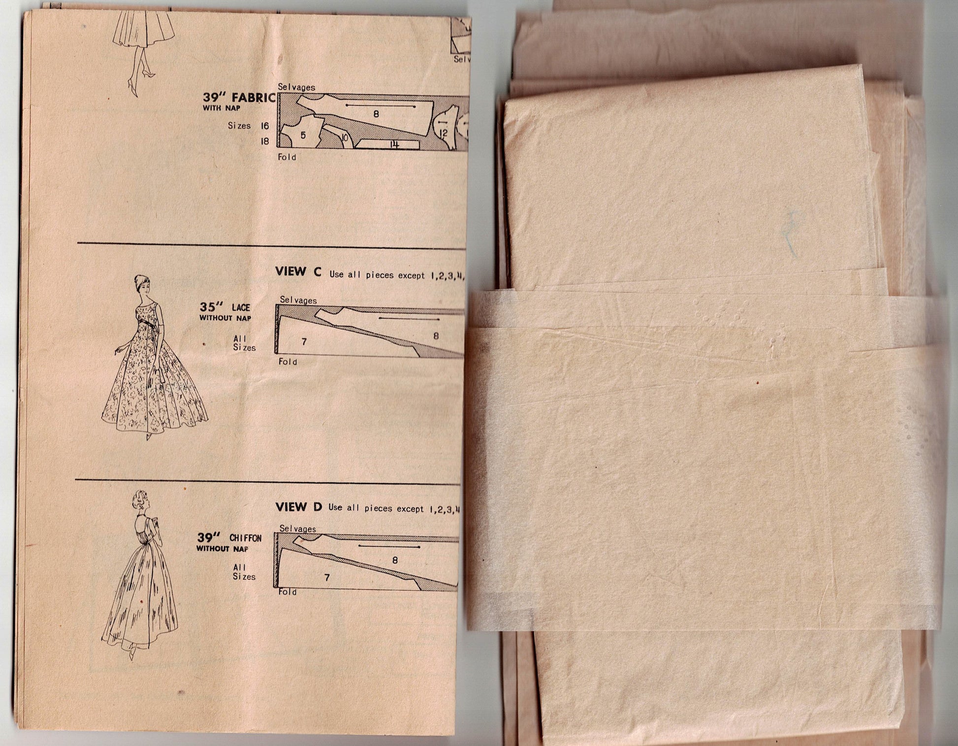 The pattern is unprinted, pre-cut and perforated with symbols. Instructions are included. Pattern tissue is in good condition, with a few small tears in some pieces. Envelope is split down one side.