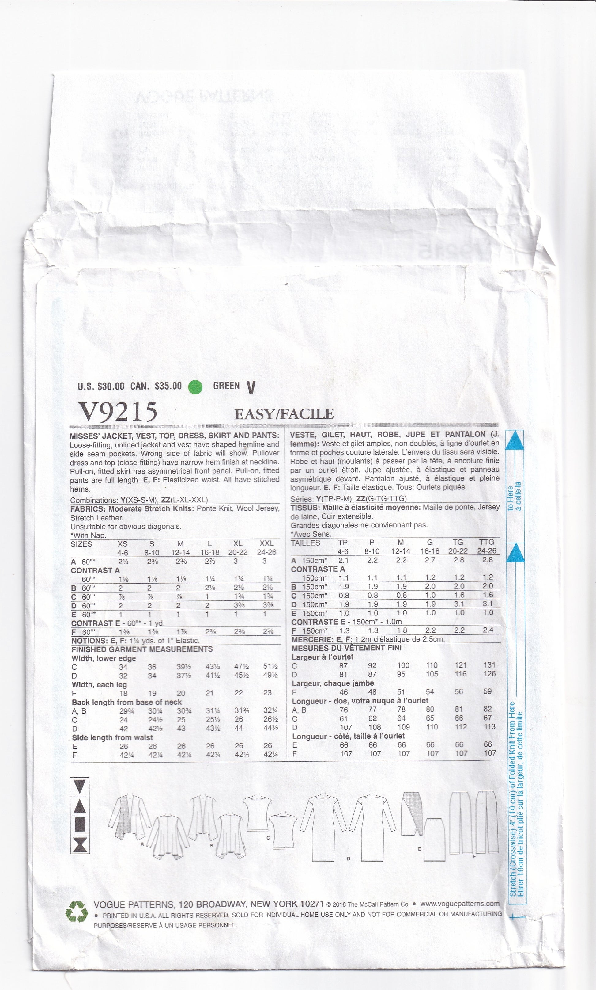 Vogue Wardrobe 9215 out of print paper sewing pattern, dated 2015.