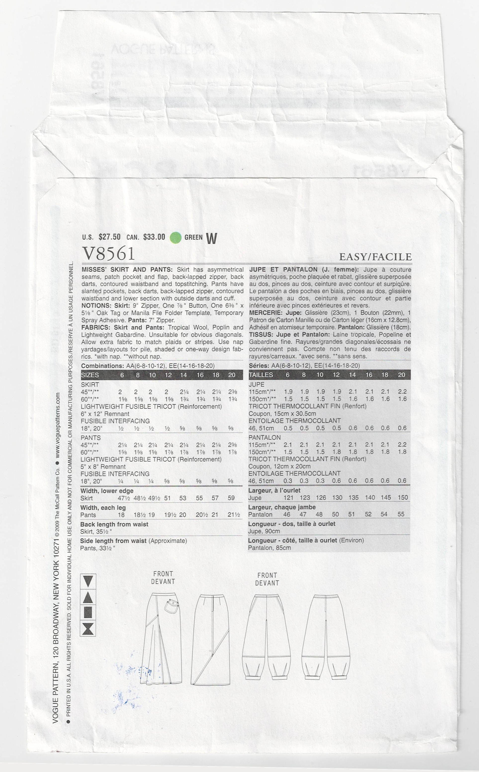 Vogue Wearable Art V8561 sewing pattern, dated 2009, now out of print.